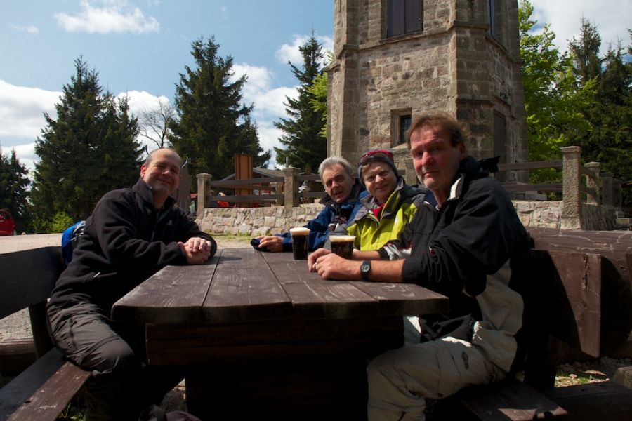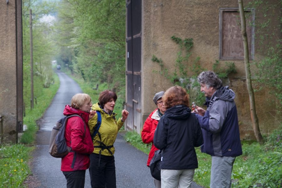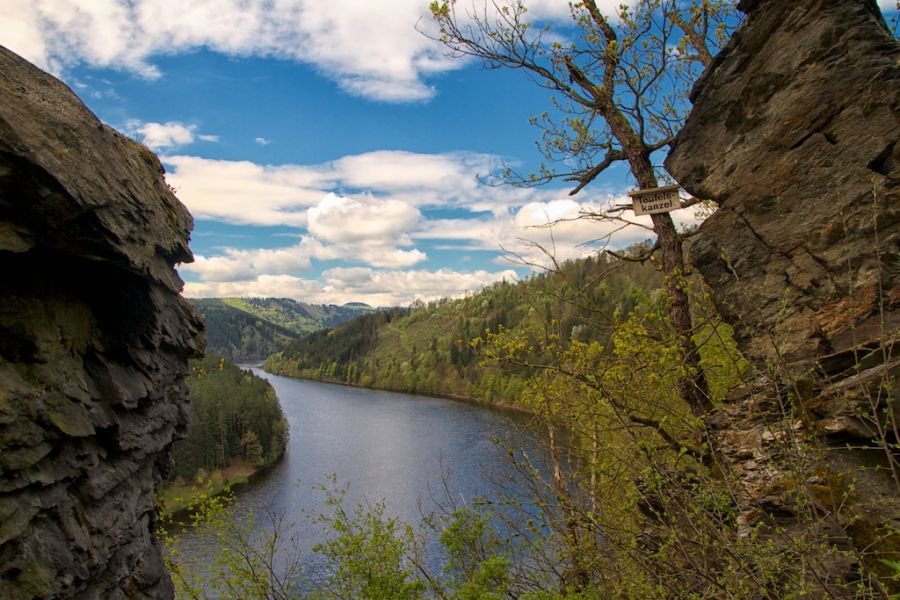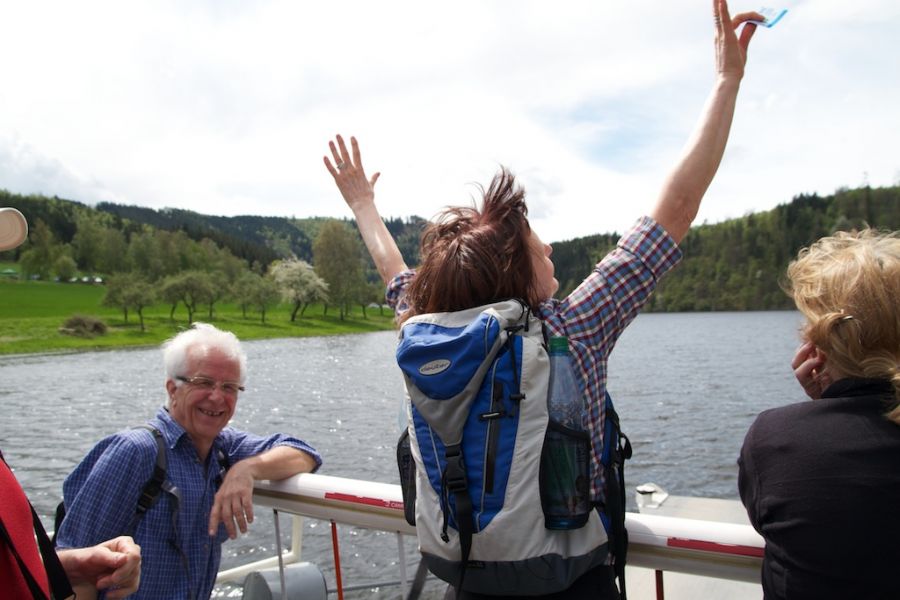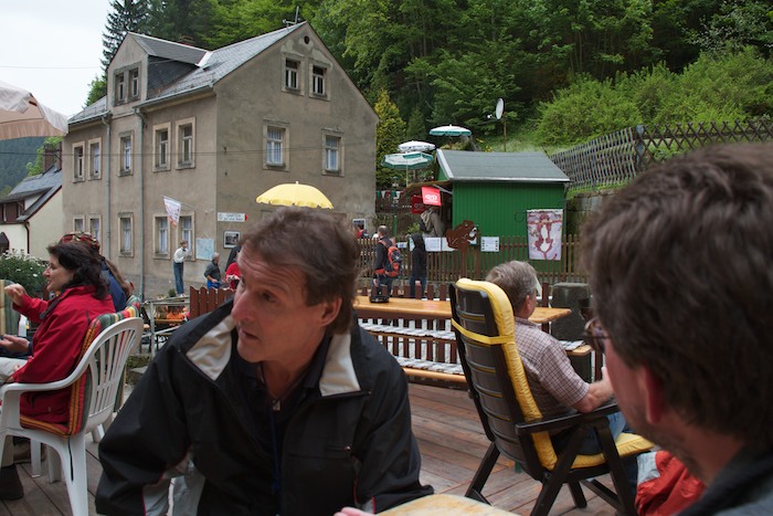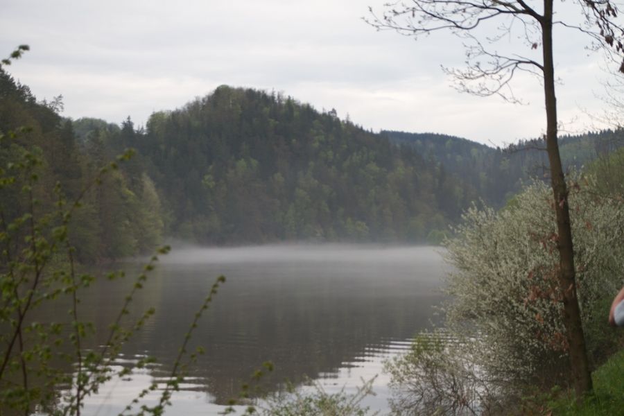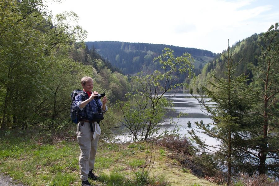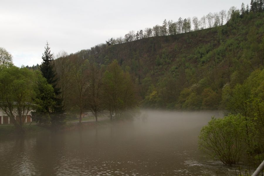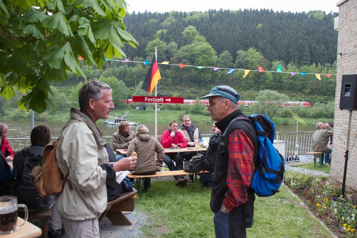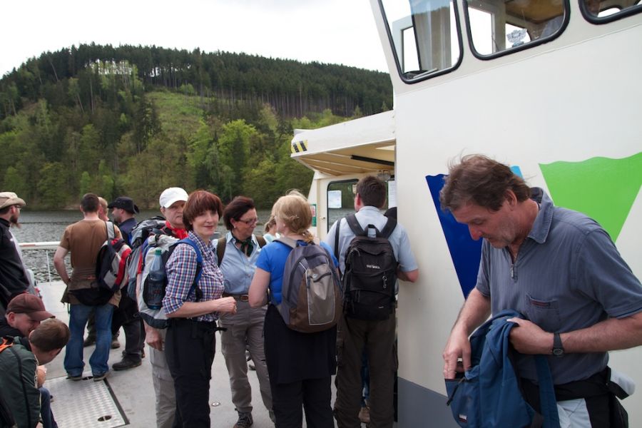 Himmelfahrt ging es bei Zeiten, begleitet noch von leichtem Nieselregen, los. Die Luft war feucht, Nebel lag über der Saale. Die Wanderung führte rechts der Hohenwartetalsperre durch ländliches Idyll. Wiesen und Wald, immer wieder mit schöner Sicht auf das Wasser. Schönster Ausblick von der Teufelskanzel. An der Linkenmühle war Mittagspause angesagt. Dies galt auch für hunderte andere. Ein DJ, der die Szenerie ordentlich mit Stimmungsmusik beschallte, sorgte dafür, dass man sich auf’s Essen konzentrierte und sich eher nicht unterhielt.