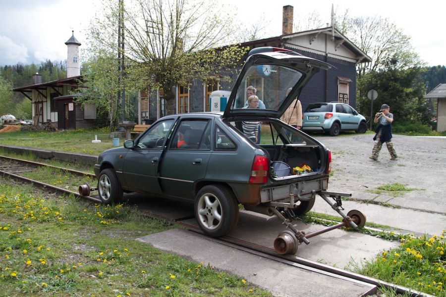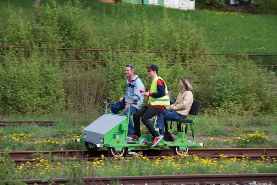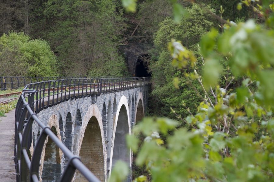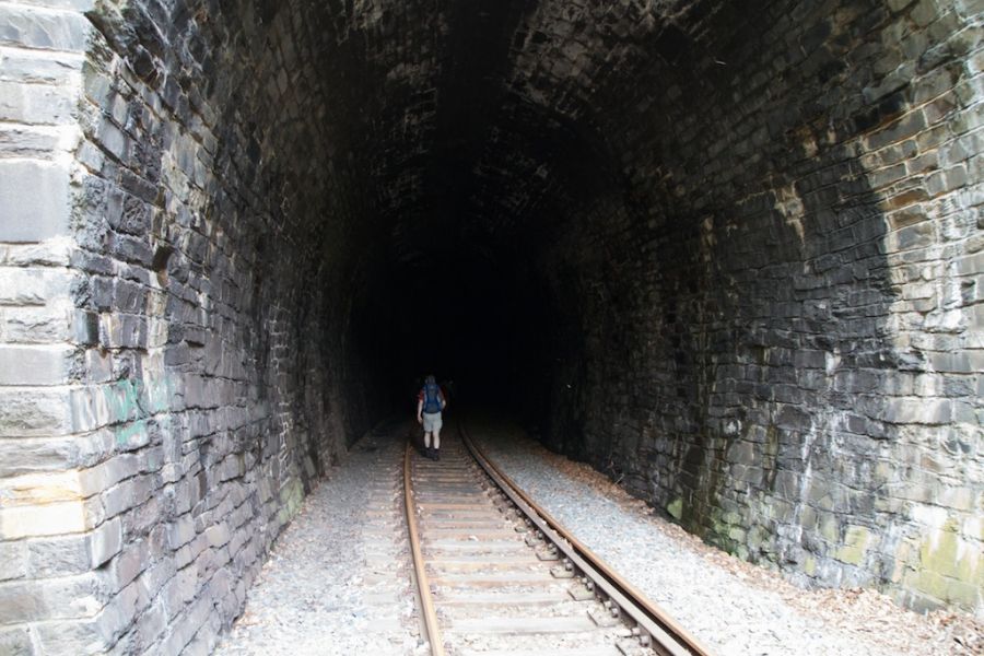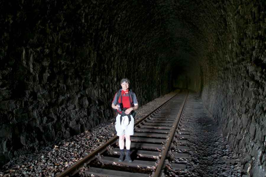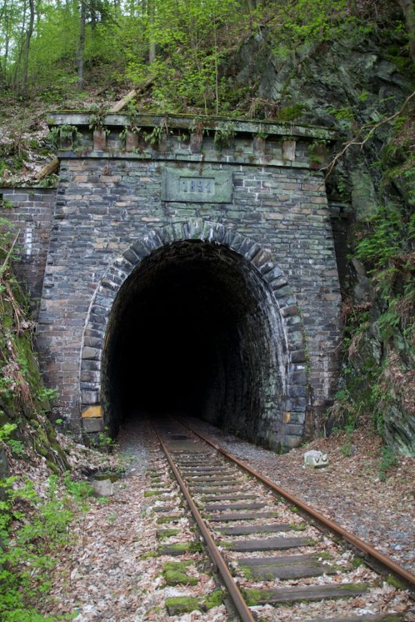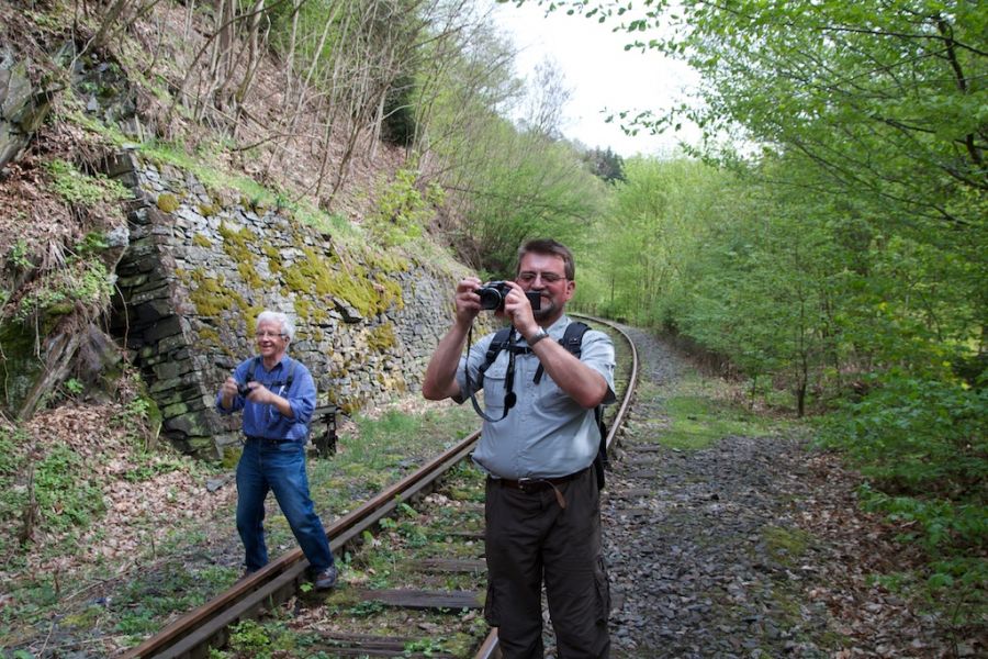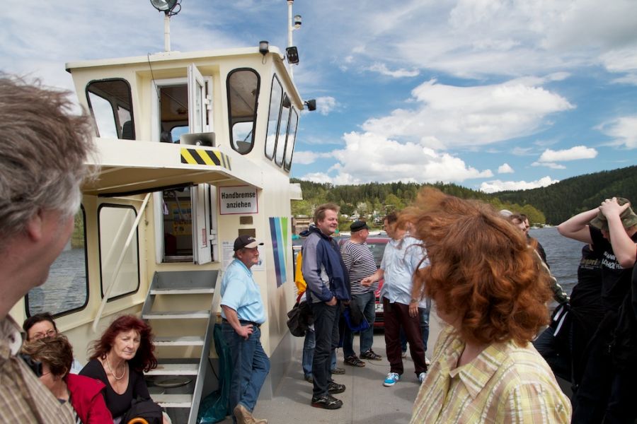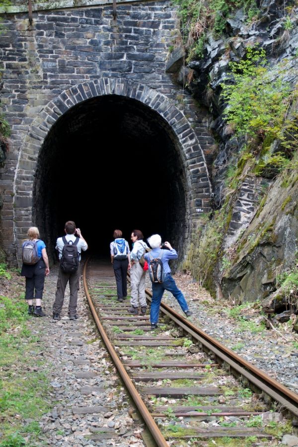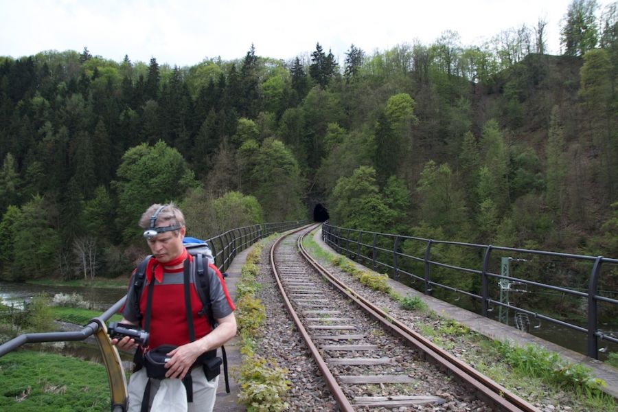 Weiter ging es mit der Fähre auf die andere Seite der Talsperre. Dabei sank die Stimmung in der Truppe kurzzeitig, da der Kartenabreißer auf der Fähre etwas von 17 km bis Ziegenrück faselte. Es kostete etwas, diese Falschmeldung aus der Welt zu schaffen, denn es sollten nur noch 10km auf uns warten, exakt die gleiche Länge wie am anderen Ufer auf dem Herweg. Highlight des Rückwegs war zweifellos unsere „Abkürzung“ auf den Gleisen der stillgelegten Bahn, durch den 181m langen Tunnel und danach über das Viadukt hoch über der Saale zurück nach Ziegenrück.